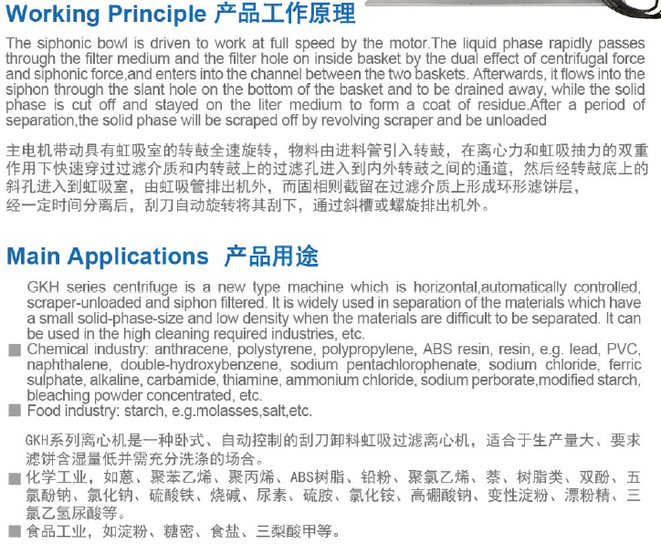 主電機帶動具有虹吸室的轉鼓全速旋轉,物料有進料管引入轉鼓,在離心力和虹吸抽力的雙重作用下快速穿過過濾介質和內轉鼓上的慮孔進入到內外轉鼓之間的通道,然后經轉鼓底上的斜孔進入到虹吸室,由虹吸管排除機外,而固相則截留在過濾介質上形成環(huán)形濾餅層,經一段時間分離后,刮刀自動旋轉將其刮下,通過斜槽或螺旋排出機外。