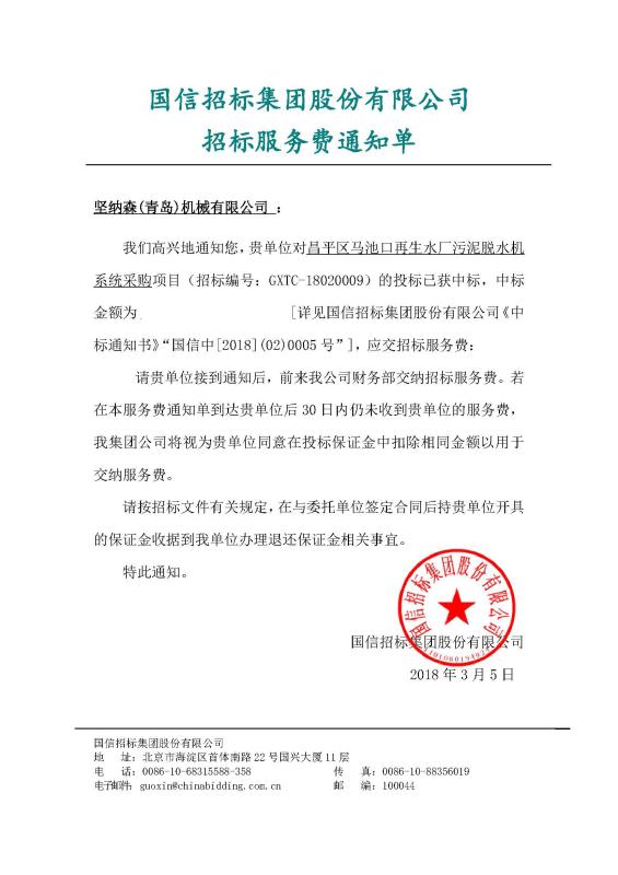 堅(jiān)納森中標(biāo)昌平區(qū)馬池口再生水廠污泥脫水機(jī)系統(tǒng)采購(gòu)項(xiàng)目